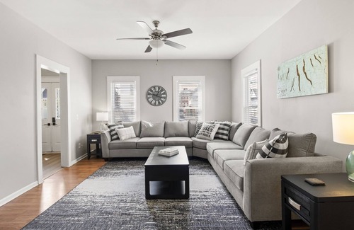 The home itself features a recently updated interior furnished for complete modern comfort. Between outings, everyone can gather on the large living room sectional to stream shows and movies on the smart TV, or you can challenge guests to some friendly competition over a few rounds of air hockey in the upstairs enclosed porch. Stainless steel appliances, woodblock countertops, a tile backsplash, and gleaming white cabinets are sure to inspire tasty home cooking in the full kitchen. Family-style feasts can be shared around the adjacent dining table.