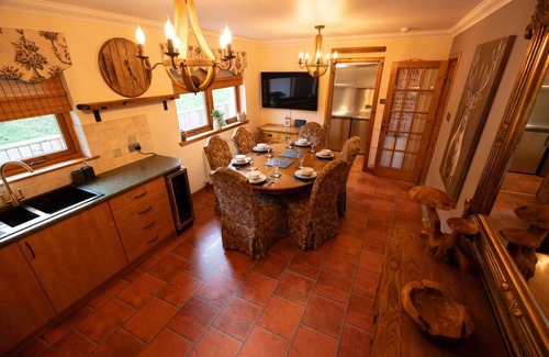 The heart of the home is the comfortable lounge at the front of the property, featuring ample seating for six. Soak in the panoramic views across Loch Linnhe. The room is warmed by a log-burning stove, creating a homely ambience enhanced by soft lighting from automated sunset lamps. A large Smart TV, coffee tables, and snug chairs provide the perfect setting for evenings in.