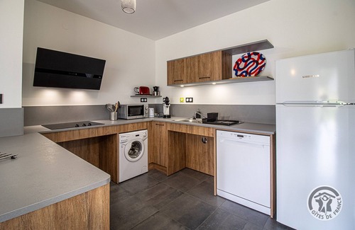 The kitchen is equipped with an oven, a stovetop, and a refrigerator, as well as a coffee maker, a microwave, and cookware. And you won't have to pack extra clothes, because you'll have a washer and dryer, too. Other amenities include a BBQ grill, an ironing board, and heating.