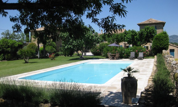 The outdoor swimming pool and lawn are shared with the two other gites making up the Auberge de Mazan. To welcome you and to meet all your needs during your stay we use a concierge from a neighbouring village who will be available to answer any queries you have about the gite or the surrounding area. The property has breathtaking views across the surrounding vines of Mont Ventoux and the Dentelles.