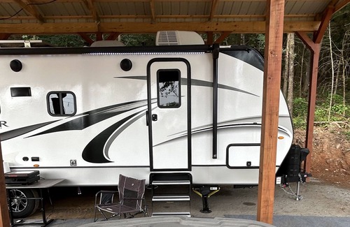 Get the feel of camping but with comfort! Relax in our hot tub after a day of hiking the beautiful waterfalls or floating in our creeks! Our outdoor space is perfect with fire pit, hot tub, grill, and comfortable chairs!! Enjoy a cup of coffee while you watch the sun come up and a cold drink while you watch the sun go down!! Perfect for both!! The inside is spacious with two recliners that have heat and massage! Large king size bed in private room, large bathroom, bunk bed with full size mattress on both for extra space. Fully functional kitchen with everything you might need. We provide coffee and creamer. Also we provide salt, pepper and oil for cooking! Good bang for your money for sure!!