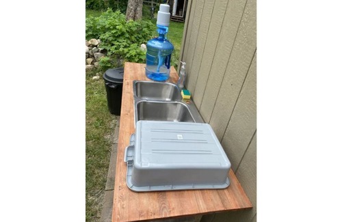 Outside: There is a BBQ and a small burner stove and utensils on a covered stand. The deck has two comfy lawn chairs which can be moved around your space. Patio table with 4 chairs & cushions. Patio propane fire pit to light the mood.