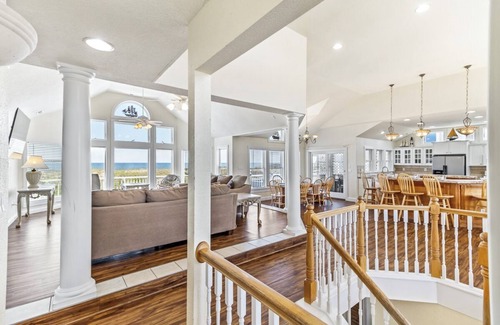 Top Level: King en suite with jetted tub in the private bath with gas log fireplace, half bath, kitchen with 2 dishwashers, a refrigerator, and raised island bar (seats 4), 2 dining areas (each seat 8), great room with Smart TV, gas log fireplace and ocean views, loft area with seating, screened porch with ocean views, deck access with panoramic ocean views.