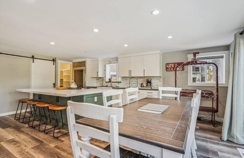 Step inside to a warm and inviting interior filled with natural light and thoughtful design. The main living area features a plush sectional sofa, a large flat-screen TV, and a cozy three-sided gas fireplace that adds ambiance and warmth while also creating a gentle partition between the living and dining spaces. It's an ideal setup for family movie nights or game day lounging. The living area opens seamlessly into the completely remodeled kitchen, where high-end appliances and a stunning interactive island with bar seating invite you to gather for a group breakfast, casual snacks, or happy hour cocktails. A dining table for six opens to the deck, extending your entertaining space right outdoors during the warmer months.