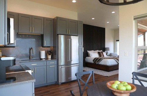Gunbarrel Studio Cabin offers a spacious 485 square feet of comfort. It features a well-equipped kitchen, a separate dining area and a private bathroom. You'll sleep soundly on a luxurious king-sized bed, and there's a pull-out sleeper chair for added flexibility. The fully equipped kitchen includes a full-size refrigerator, oven/stove, microwave, and ample cabinet space. We've stocked it with all the tools and gadgets you'll need to prepare delicious meals. Don't forget to try the Traeger grill on the deck for outdoor cooking. The large windows flood the cabin with light during the day and blackout shades create a cozy den for a peaceful night's rest. Enjoy your morning coffee on the deck while breathing in the fresh mountain air. Gunbarrel Studio Cabin is sure to become your home away from home.