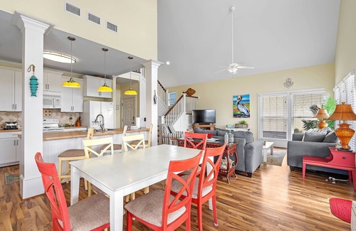 • The kitchen is fully equipped with everything that you could need in your home away from home. The dining area has seating for six and three bar stools for additional seating.