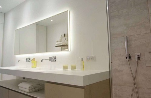The main living room is integrated with the dining area and kitchen, creating an open, loft-like feel. Sliding glass doors open out onto a balcony that runs the length of the apartment, which makes a great spot for a sunset apero while watching the yachts return to port. A 'vertical garden' decorates the wall at one end of the terrace, and a grill at the entrance to the kitchen makes hosting a barbecue simple. The kitchen itself is modern and designed for ease of use, with a large center island, Siemens appliances and a Lavazza espresso machine.