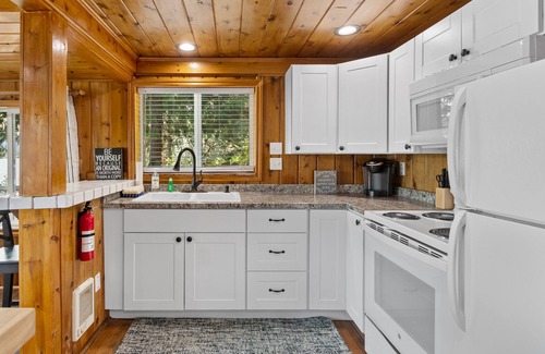 Right on the water and boasting fantastic lake views from the private balcony and living room, this charming home is just the place to enjoy an ideal lake vacation with friends and family. When you're not fishing down at the banks or swimming off the dock, spread out on the home's expansive deck to catch up with old friends over some ice-cold refreshments - you'll love taking in the scenic lake views while lounging in comfy Adirondack chairs. Inside, the home enjoys an all-wood interior with knotty-plank walls and ceilings, burnished floors, and plenty of space to move around. The living area is bright and open and includes comfortable furnishings and a gas fireplace with a large TV mounted just above. The full kitchen has all the appliances and counter space the family chef needs to turn out a world-class meal, and you can serve guests at the handsome dining table while the kids swing their feet from the breakfast bar stools.