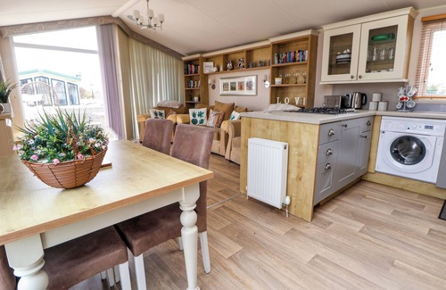 Amenities: Gas heating. Electric double oven, gas hob, microwave, fridge, freezer, washing machine. Smart TV with Sky, Netflix, WiFi, selection of books. Fuel and power inc. in rent. Bed linen and towels inc. in rent. Roadside parking for 2 cars. Enclosed front garden decking with lawn, and furniture. One well-behaved pet welcome. Sorry, no smoking. Shop 0.5 miles, pub 1.2 miles, beach 0.8 miles, lake 1.1 miles. Note: Steps up to property. Note: On-site swimming pool available for customers.