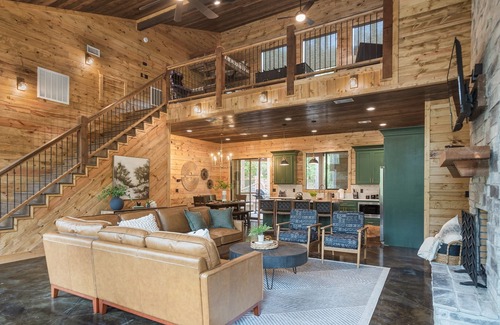 The cabin sleeps up to 10 with 2 identical king bedrooms and a bunk room. The two master suites are located on the first floor on either side of the main living area. The bunk room is in the 2nd floor with access via a wide staircase in the living room.