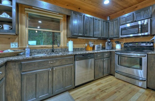The dining area seats 8 with 4 extra seats at the breakfast bar. The kitchen is fully equipped with a knife set, toaster, Keurig, French press, mixing tools, dishes, kids dishes, measuring tools, mixing bowls, casserole pans, silverware, rolling pin, lighter, wine opener, can opener, pizza cutter, peeler, garlic press, Tupperware, grater, strainer, cutting boards, crock pot, pitcher, masher, BBQ tools, scissors, blender, pots and pans, baking sheets, and muffin pans. There is a gas grill on the deck that is attached to the main gas line of the cabin, so you will not need to bring propane.