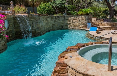 Soak in panoramic privacy from thick surrounding bamboo and arching live oak trees. The Insta-Worthy waterfall, with bench underneath, will take your mind off life for a while and make you feel you have indeed escaped. Ample pool floats and striped towels provided. Oct-May the pool is heated to 87 degrees. No heated pool fee.