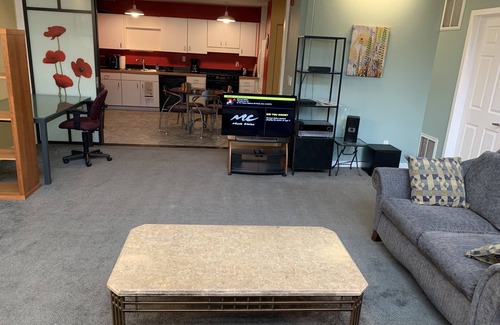 The lower level (about 1200 sq. ft.) is a lock-off suite with a large living room, master bedroom, full bathroom and kitchen. The living room has a sunroof ceiling that keeps it bright and comfortable. A Murphy bed in the kitchen provides a second sleeping area that can be separated from the living room by a sliding wall. The master bedroom has a queen bed, a desk and private door into the bathroom.