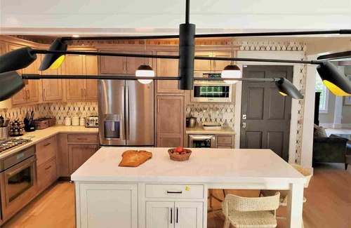 Brand-new, fully-equipped kitchen with custom wood cabinets, stainless appliances and quartz countertop. Included are a Thermador gas cook top and wall oven, Bosch microwave/convection oven, GE Profile refrigerator, and beverage cooler. There is a second refrigerator inside the garage. Farm-style table seats up to 10. Adjacent island seats 3. Outdoor dining set on the rear patio seats 8.