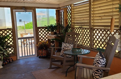 Enjoy the salt air and ocean breeze without leaving the property! Rocking chairs and bar stools provide seating in the side porch/breezeway. The ground level deck in back has bench seats and throw pillows for your comfort.