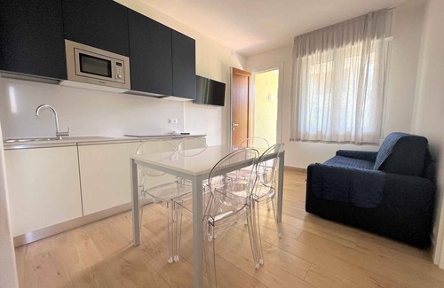 The holiday apartment is located in an apartment house, was renovated in 2023 and is furnished in a modern style. The property is located in a holiday resort, in the town centre. Also due to its quiet and sunny location the domicile is popular. Available for use: children's playground.LocationBibione, district Spiaggia. The holiday apartement is located in a holiday complex. Parking (for 1 car) is available on the property. Specialair conditioning, electric heating.Facilities: internet access (WLAN) and safe. TV reception takes place via antenna. TV channels only in local language.For your safety, the accommodation is equipped with CO2 detector and fire extinguisher. PoolAll pools are available for shared use. Outdoor pool (usable from mid May to mid September, 7 m x 10,50 m, depth 1,40 m). Children's pool (2 m x 3 m, depth 0,60 m). Dogsnot allowed. DistancesShopping 200 m, restaurant 200 m, town center 200 m. discotheque in Bibione Pineda 2 km. Bibione Spiaggia: doctor, pharmacy, bank each 1000 m. thermal bath, indoor swimming pool, sauna each 200 m. railway station in Latisana 20 km. airport in Venedig 90 km. In summer: Adriatic Sea 500 m in Adriatic Sea (beach 500 m in Adriatic Sea featuring sand). fishing, diving, boat rental, boat launch each 3 km in Bibione Pineda. Bibione Spiaggia: horse riding 1000 m, tennis 500 m and mini golf 800 m. golf in Liggnano Sabbiadoro 3 km. water sports in on the beach 500 m. DivisionHoliday apartment, 1 floor, 2 rooms (including 1 bedroom), 35 sqm, in total 5 beds (including 2 additional beds). RoomThe entrance to your holiday apartment is located on the ground floor, is at ground level and leads directly into the living room. Living room with 2 additional beds on couch/sofa, TV, dining area (5 seats) and access to the terrace (garden furniture, 1 table, 4 chairs). Bedroom with 1 double bed and 1 single bed. Cooking nook in the living room with electric stove (induction stove, 4 plates), dishwasher, fridge (icebox), microwave, washing machine and access to the terrace. Bathroom with shower, 1 washbasin, WC, bidet and window. Credit cardsVisa, MasterCard. Terms of lease and pricesIncluded in the priceOutdoor pool, air conditioning, parking place, electricity, water, beach service (1 sunlounger, 1 chair, 1 parasol) (16.05.26-20.09.26), bed linen (first usage), hand towels (first usage), Wireless Internet access. Side costs-Additionally(Payable when booking)/additonal fee for short-term stays (less than 6 nights) obligatory 40% per booking per stay.Costs on the spot:/Obligatory:final cleaning (if not performed by the tenant) 40 € per object per stay. local tax by local tariff (if charged).On request:children bed 15 € per bed under 3 years per week. children chair 10 € per piece under 2 years per week.Deposit:EUR 200,-/object.