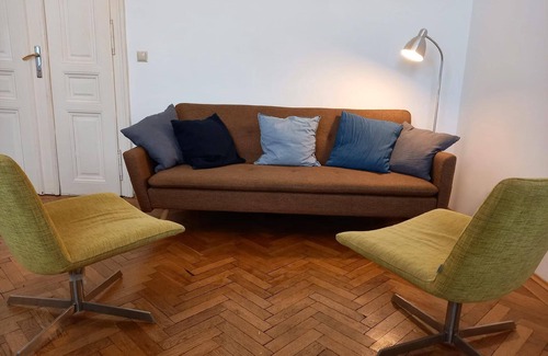Cosy old flat in a traditional Viennese townhouse built around 1903. The flat is on the 3rd floor and has a fully equipped kitchen, 2 separate bedrooms, a living room/bedroom and a bathroom with shower and washing machine. As is customary in the old Viennese town houses, the WC is located in a separate room.