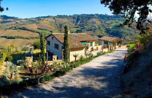All flats have luxurious furnishings and are quietly situated above a large vineyard slope. The large garden of approx. 6000 square metres with olive, fig and fruit trees is at guests' disposal, as is the barbecue area with "alpine" table/bench and bench in the olive grove, popular as a breakfast spot with fantastic panoramic views of Ripatransone (480 m above sea level).