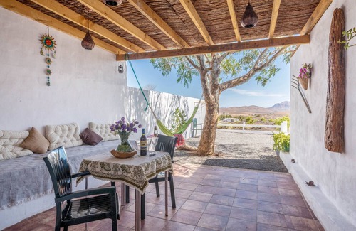 The cosy holiday home “Adonai” is situated in a rural area near Tuineje in the south of Fuerteventura and offers wonderful views over the mountainous area. The 70 m² holiday home consists of a living room with a sofa bed for 2 people, a well-equipped kitchen, 2 bedrooms (one with 2 single beds) as well as one bathroom and can therefore accommodate 6 people. Additional amenities include Wi-Fi, a washing machine, fans, a television, a highchair (on request) and a babay cot (under request for no extra charge). The outdoor area comprises a private covered terrace with seating furniture and a hammock for you to relax in with a book or a glass of wine. There is also a little garden area, which is shared with the homeowner. From the outdoor area, you will have great views over the surrounding hills and mountains. You can find a supermarket after 4 km or a 7-minute drive, while the nearest restaurants and cafés are about a 7-minute drive (4.8 km) away. After about 12 minutes by car (10.5 km), you can get to the nearest beaches like Playa Giniginamar. Tuineje is a 15-minute drive (13 km) away, and the beautiful Oasis Wildlife Park can be reached after a 15-minute drive (12 km). The island’s airport is located 50 km (a 45-minute drive) northwest of the holiday home.