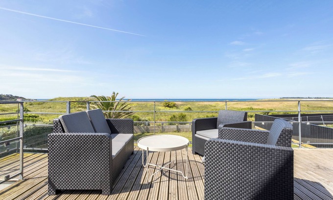 With its 180° sea view over the Steir beach, its generous volumes, its 800m² enclosed garden and its large terrace, this 115 m² house is ideal for vacations, just a stone's throw from the ocean.