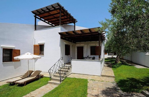 Comfortable holiday homes in the bay of Trikorfo on a slight slope with a wonderful view of the sea. The houses, which were extensively renovated in 2024, are located above the coastal road and are 350 meters from their own long stretch of beach (accessible via an underpass). The total of 30 well-kept maisonettes are surrounded by olive trees and are located in the middle of a garden plot of around 74,000 square meters. In the lower part of the complex there is a cozy beach tavern with a view of the crystal-clear sea. Footpaths and small driveable alleys lead to the various residential units, each with reserved parking spaces. Extras included: Welcome package Sunbeds and parasols on the beach Intermediate cleaning included twice a week Activities nearby: Recommended excursion destinations include a boat trip around Athos, the Petralona stalactite cave, ancient Olinthos, the district capital Polygyros or a Chalkidiki tour Mobility: Not suitable for people with limited mobility