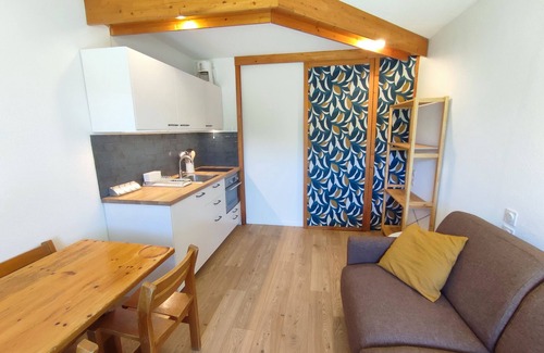 You have a living area with a fully equipped kitchen, a dining area, a Rapido sofa bed (140x190), a bedroom with two bunk beds (80x200), a bathroom, and a south-facing terrace offering a magnificent view of the mountains. An outdoor closet is also available for you.