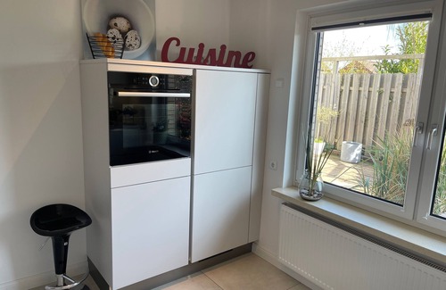 The house is located on a mature property in a quiet residential area. It is completely renovated and up to date. In the large living and dining room you can go on vacation like at home, a huge window front to the 35 sqm wooden terrace lets in light and sun. No wishes remain unfulfilled in the modern kitchen. Enjoy the large induction hob, the high-quality oven and the extensive equipment. In the bathroom you can start the morning relaxed with a rain shower and underfloor heating. A large bathtub lets the winter days pass quickly. There are two fully equipped bedrooms, each with a double bed (180x200 single mattresses) and plenty of cupboard space. Complete darkening is possible. One bedroom has access to the covered balcony (loggia) where you can sit comfortably in the evening to catch the last rays of sunshine.