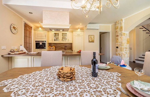 Beautiful holiday house SEASCAPE I is located in Porat near town Malinska. It can accommodate 6 - 7 persons and has three bedrooms and two bathrooms, spreading over two floors. In the ground floor there is a living room, kitchen with dining area, pantry and a toilette. Upstairs you can find one double bedroom, two bedrooms with two single beds that can be joined into a double bed, two bathrooms with shower and an additional toilette. In the spacious outdoor area there is a private heated pool, a covered terrace, barbecue area and plenty of room for enjoyment! Outdoor additional toilette, outdoor shower. Parking spot provided.