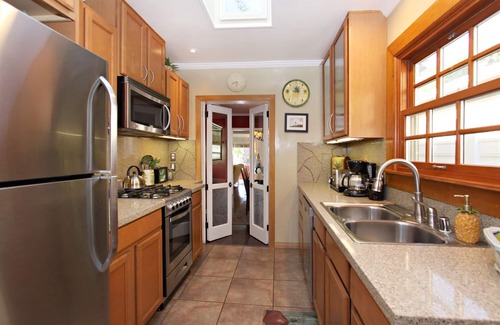 The Pineapple Bungalow offers a modern, sophisticated bathroom with a glass/tile design, a full-size tub/shower, a skylight, and a window. This meticulously appointed house is designed for a perfect vacation, complete with free Wi-Fi, parking passes, a washer, and a dryer. Enjoy wonderful Pacific Ocean breezes, and barbecue on the shared rooftop deck. Relax on the deck while watching the sunset. While the deck doesn't offer ocean views, the beach and boardwalk are just a 3-minute walk away.