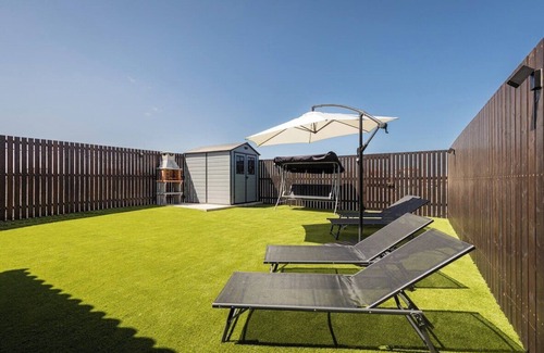 This lovely house with large outdoor areas for sunbathing and relaxing, is ideal for families, couples and business trips as it can accommodate up to 6 people and has Fibre Wifi Internet. With two cosy bedrooms, the main one with a queen size bed and the second one with two single beds, which can be joined or separated as needed. Both have direct access to the terraces of the house. It has two bathrooms with bathtub, one on each floor, fully equipped kitchen with all appliances integrated in the living room, which also has a large sofa bed and terraces for exclusive use with wood barbecue, sun loungers and pleasant outdoor spaces where you can have lunch, disconnect and sunbathe. It has a 55" Smart TV and parking facilities in the area. The residential complex has a paddle tennis court, swimming pool, communal gardens and children's playground. It also has a small supermarket for the convenience of the neighbours.