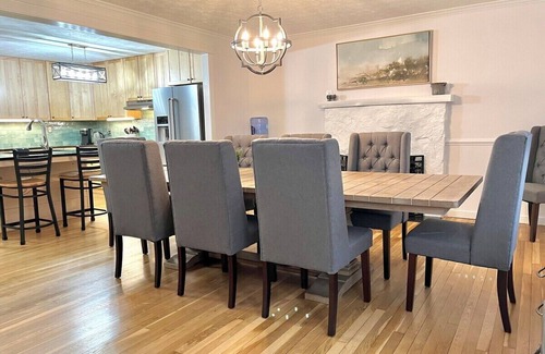 Everley Home: Enter the front door to a spacious kitchen and dining area with a dining table for 8 and additional bar stools at the counter. We will have an additional folding table in the fitness room that can be set up by the dining table with seating provided (lighter chairs on lower level that can easily be brought up from downstairs for 4-6) so your entire group can comfortably eat together in the space. There is a deck off this area with dining seating and for all the grill aficionados there is a "Big Green Egg" grill and a separate standard 4 burner stainless steel propane grill.