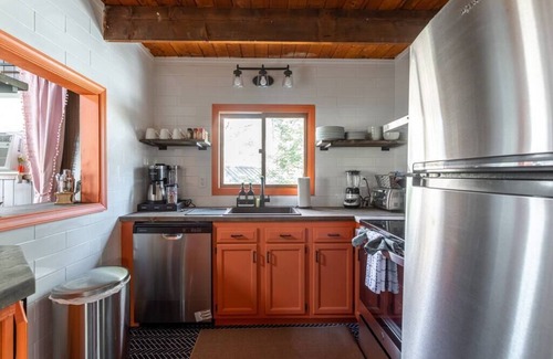 The house includes cooking ware (pots, pans, plates, utensils, baking dishes), but guests need to bring personal grocery items (seasonings, flour, sugar).