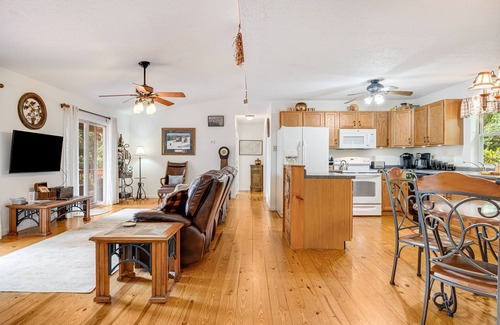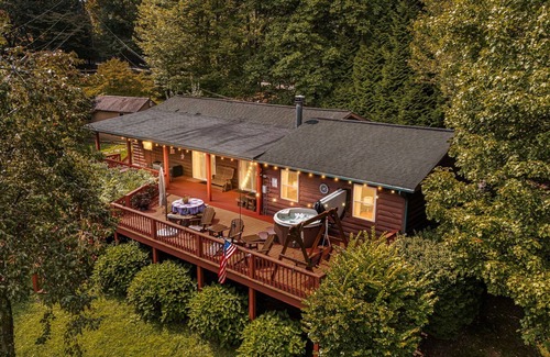 Welcome to Smoky Mountain Mecca, an ideal destination for groups looking for a quiet getaway near Maggie Valley, NC and the Cherokee entrance to the Great Smoky Mountains National Park. The home's large back deck is "decked out" with a hot tub, an outdoor dining table, and lots of sweet spots to kick back and take in the year-round mountain views. You'll find a bench swing and a double-rocker, plus a covered area for unpredictable weather. Relax in the light-filled great room while enjoying the breeze blowing in through the double screen doors. If a wood-burning fireplace is on your list for the best mountain vacation rental, you'll love the central stone hearth that warms the whole home on a chilly evening. The well-kept kitchen has everything you need to make homemade dishes and the gas grill is ready for a cookout. Children will appreciate the grassy yard to play in with mature shade trees that offer brilliant colors in the Fall season. In the evening, treat yourself to a soak in the hot tub and wind down with stargazing and storytelling by the fire pit (Wood Supplied!). Comfortable furnishings and easy, one-level living make Smoky Mountain Mecca a favorite among Western North Carolina rental cabins. The home has a flat, paved driveway with plenty of parking. Simplify your Smoky Mountain vacation with a stay at Smoky Mountain Mecca! This Asheville vacation rental is located in Waynesville and is approximately 41 minutes to downtown Asheville.