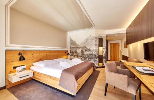 This modern, 4-star hotel in Grainau lies directly on the banks of the scenic Badersee Lake. Features include a conservatory restaurant with panoramic mountain views, and classically furnished rooms with a balcony. The bright rooms at Hotel am Badersee offer free WiFi, a desk and a flat-screen TV with cable channels. A hairdryer is also provided in the private bathroom. The Werdenfels restaurant serves Bavarian and international cuisine, and snacks are available in the café throughout the day. The bar features a fireplace, comfy armchairs and a flat-screen TV with Sky Channels. The spa area includes massage facilities and a sauna with beautiful views of the surrounding mountains.