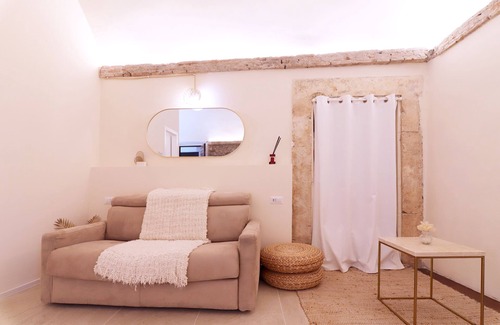 The apartment is on the ground floor and has just been renovated to restore its original Roman-era layout. It features a high vaulted ceiling, a stone wall, and a glass panel displaying a beautifully preserved 17th-century floor uncovered during the renovation.