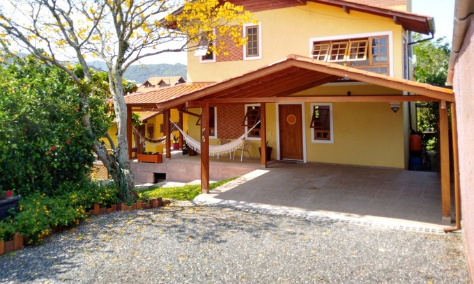 The house is in a safe and quiet place with lots of nature around. It is 500m from the beach of Campeche, and close to the local infrastructure of supermarkets, restaurants and bars. The house hosts 6 people, with preference for couples and families. We are well located, close to Armação, Matadeiro, Ribeirão da Ilha, Lagoa da Conceição, Joaquina and Praia Mole beaches, the center is 10 km away. It will be a pleasure to welcome you! The house has 3 bedrooms (1 en suite, bathroom with hydromassage) with double beds, air conditioning, ceiling fan and cabinets. In addition there is a sofa bed and two single mattresses as an option for distribution of guests in the rooms. The kitchen is equipped with a cook top stove, refrigerator, electric oven and microwave, sandwich maker, toaster, blender; crockery, pots and cutlery; tablecloths and tea towels. We also have 6 beach chairs and 01 umbrella. We also provide bed linen, blankets, pillows, bath towels and face. Attached to the house, there is also a barbecue area. We accept small pets.