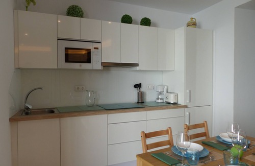 Fully equipped kitchen with microwave, coffee maker and utensils
