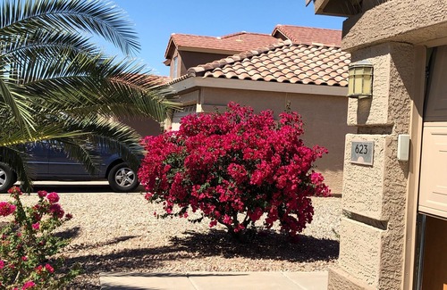 Three bedroom, 2 bath house in Sundance Golf community. House has private pool, hot tub and garage (garage parking is not available as we keep our car in there) with 3 outside parking spaces. Quiet neighborhood. Very nice one level ranch. No smoking. Sleeps 6 nicely. Pool is heated by solar panels so outside temperatures need to be in the eighties to heat pool warm enough to swim. Washer and dryer are also included. There's a barbecue grill, a coffee maker, blender, toaster, icemaker, dishes, towels, bedding, etc and cute patio furniture. It's a lovely place to relax. Wi fi included. We also have two bicycles for your enjoyment. Dogs allowed with fee.