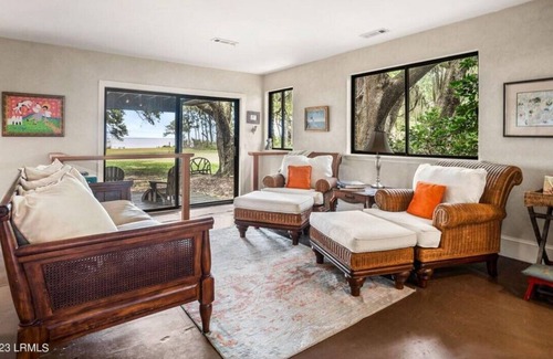 This treasured Coffin Point beachfront gem sots on an idyllic .87 acre lot with a sweeping lawn from the house down to the beach. This unique house incorporates heavy timber beams and flooring reclaimed from a local mill. Atmosphere is further provided by the 18 legacy live oaks drenched in Spanish moss, creating a serenity that defines Lowcountry living. Abundant coastal wildlife is visible from the property - dolphins, osprey, pelicans, and deer. Imagine yourself sipping coffee while watching the sunrise over the water, or beach combing on the private beach for shells or sharks teeth!