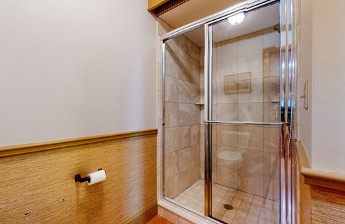Inside, the spacious living room is composed of vaulted ceilings, an impressive stone-lined wood-burning fireplace, and comfortable furnishings. Dual-sided for extra warmth, the fireplace also warms the full kitchen. A pleasant space to play chef, the kitchen displays ample meal prep space and stainless steel appliances. Steps from here, the private office is great for remote work situations.