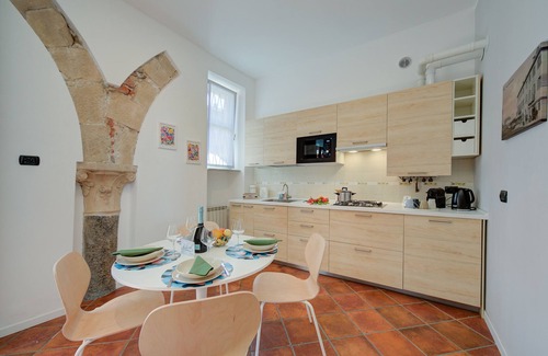 The ground floor apartment is in a building called Dimora dell\'Antico Porto. It is right on the shores of Lake Maggiore in the oldest piazza in the town of Arona, next to the 14th century harbour, which used to be much busier than it is today. The charming little church across the square from the residence was built in 1592.
