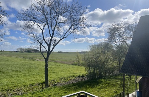At Ferienhof Peter you will find a cozy, blue and white furnished apartment with a hall, a kitchen with dining area, the adjoining living room, a separate bedroom and a bathroom with shower. The detached house with several apartments is located on a quiet village street, the main street is about 1.5 km away. To the south there is a small pond as well as meadows and fields, behind it you can see the dike directly from the balcony, on which you have an unobstructed view.
