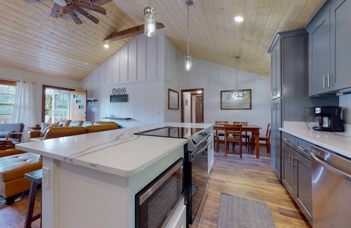Upon entry, you'll be met with a bright interior and a cozy atmosphere throughout the well-appointed living area. Marvel at the high ceilings, the blanket of natural light, and the contemporary furnishings of this updated home radiating comfort from every corner. Relax and make yourself at home by resting on the plush furniture, streaming your favorite movies on the large TV, or carrying on great conversations among the open-concept floor plan. Prepare grand meals and hiking snacks in the sophisticated kitchen, equipped with stainless steel appliances, ample cupboard room, a floating island breakfast bar, and a formal dining table. Comfortable beds in spacious bedrooms ensure everyone receives a wonderful night's rest from the day's adventures. A game room with a large TV, board games, and plenty of room to sprawl out will entertain everyone for hours. At the end of the day, watch the sunset from the expansive deck or stargaze beside the crackling fire in the firepit.