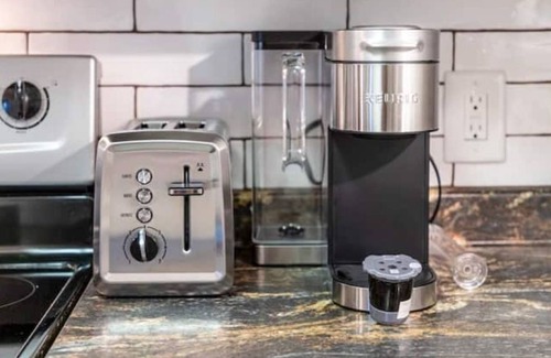 The kitchen has all the usual flatware, cookware, dishes, and prep tools. There is a refrigerator/freezer, dishwasher, stove (electric), Keurig coffee maker, microwave oven, hand towels, and dish soap.