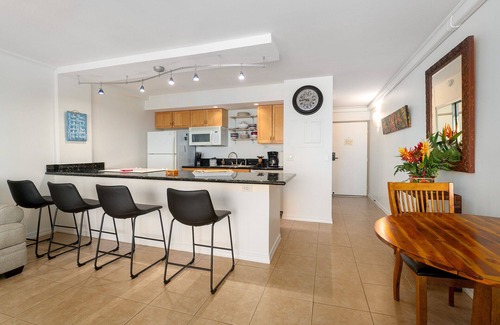 This ocean view condo with a generous lanai at the Island Surf resort in Kihei is just steps away from amazing beaches and in the perfect location for enjoying all South Maui has to offer. Open the gigantic sliding glass door to soak in the sounds of the beach and the park across the street, or keep it closed in quiet, air conditioned comfort as you marvel at the Pacific Ocean’s ever changing beauty.
