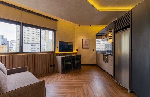 THE APARTMENT Our flat in Hampton Park was recently renovated and has the style of a hotel room with everything new and well maintained, from the dark wood that covers the wall and hides the bathroom door to the kitchen utensils for you to have more comfort and practicality in your home. your stay. The bathroom and bedroom have molding lights that, together with the full-wall mirror, bring elegance to the accommodation, matching the building and lifestyle of the Jardins neighborhood, the decoration is in dark wood and warm lights that give the apartment a golden color. to give a warm and refined ambience. Complete equipment with a strong shower, queen-size bed, refrigerator, microwave, water filter, induction stove, capsule coffee maker, wi-fi, television and bedside lights. THE NEIGHBORHOOD Jardins is one of the most chic neighborhoods in São Paulo, known for its high standard establishments and privileged location, Hampton is located next to Avenida Paulista, Oscar Freire and Parque Ibirapuera, everything for you to go out and find many options for leisure without moving too much. THE BUILDING Hampton Park is a hotel located in the heart of São Paulo with a renovated structure and great comfort, it has a 24-hour reception, gym, restaurant and rooftop pool, everything to relax and enjoy your stay with luxury and refinement, having everything at your fingertips. .