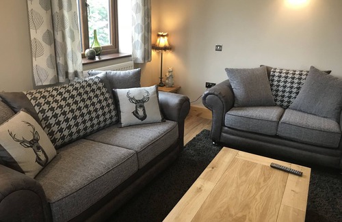 The exterior of this cabin is built in a traditional log-cabin style, with a plastered interior. The property is purpose built, single story, with wood effect flooring throughout. Two double bedrooms offer 2 double beds, with a charging point built into beds, televisions in both bedrooms as well as the lounge. Your kitchen area is equipped with a dishwasher, washing machine and fridge.th small freezer compartment.
