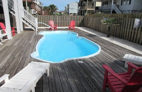 Amenities include a 10' X 22' private pool, gas grill, enclosed hot and cold water outside shower, central heat and air, washer and dryer, dishwasher, microwave, coffee maker and Keurig machine, blender, cable TV in each bedroom, and WIFI. The kitchen also includes two small fridges in addition to the main refrigerator for extra storage. There are pool floats and beach chairs available to renters in the downstairs storage area.