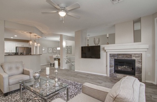 Make yourself at home in our immaculate resort style 2 bedroom, 2 bathroom condo in a gated community with garage parking for two vehicles plus direct access to the condo. Enter the condo on ground level and walk up a flight of stairs to find an open floor plan and a complete remodel. All the beautiful designer touches make this condo really stand out. The kitchen has a microwave, dishwasher, fridge, stove/oven, Keurig coffee maker and also a tradional coffee maker and items to prepare your meals and a dining area seating for 6 plus 2 barstools at the kitchen counter. The cozy living room has a sleeper sofa for additional sleeping and 2 chairs along with a custom gas fireplace and a flat screen 55" smart TV w/ Youtube TV Live. Step outside onto the balcony just off the living room that has outdoor seating and dining on those beautiful Arizona mornings or evenings.