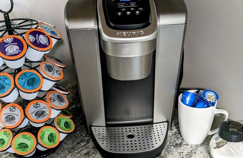 Fully equipped open concept kitchen with cooking basics, Keurig coffee maker, dishware & flatware, microwave, toaster, and newer appliances.
